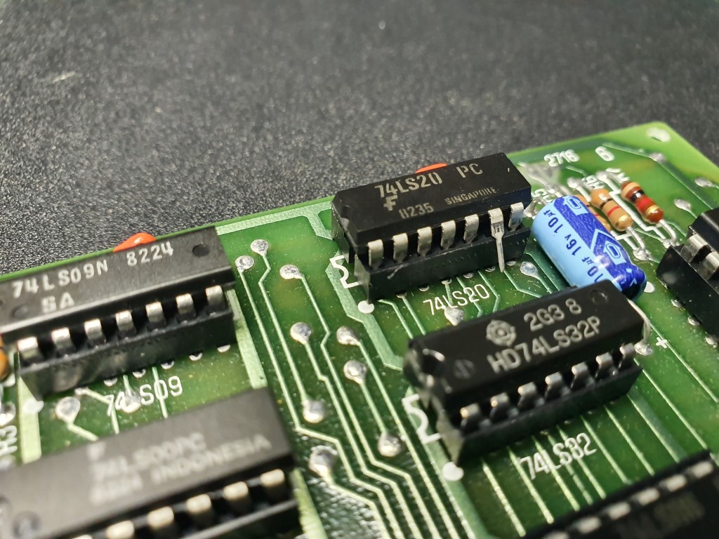 Step 2 - install a 4k7 (4700 ohms) pullup resistor on the rear of the board between the socket of A5 (74LS20) pin 6, and A5 pin 14 (+5V).