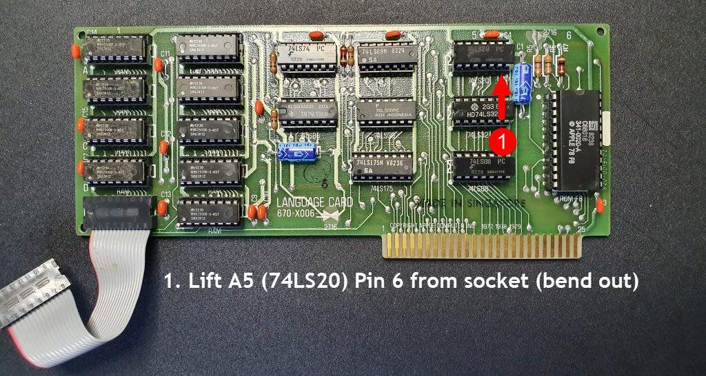 Firstly, we need to disable the Language Card F8 ROM (with ROM X you dont need it!), and secondly we need to ensure that the slot inhibit signal is not asserted by the Language Card with access to the $F800 address space (inhibit must still be allowed to function normally for Language Card RAM access). Fortunately both of these needs can be met with a minor modification centred around pin 6 of the IC at position A5 (74LS20), which is the output of a quad NAND gate. This pin drives the chip select for the F8 ROM, and also further logic that controls the inhibit signal. We need to isolate the output of this gate from the PCB to ensure that it has no control over these signals, and then we need to pull the pin 6 trace on the PCB high (+5V), disabling both the F8 ROM chip select and inhibit line for ROM access.