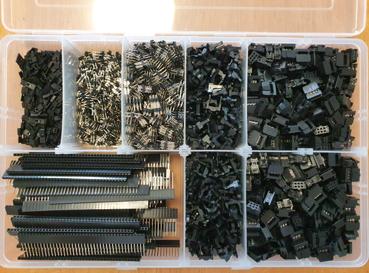 The pin headers at bottom left are the ones that will be used to plug the modules into your motherboard. They have a rectangular profile less than 0.4mm in thickness, and won't damage the sockets like pin headers would. Using the jig I designed, they will be fitted to the board, then the top black socket section snipped off (these are stacking headers).