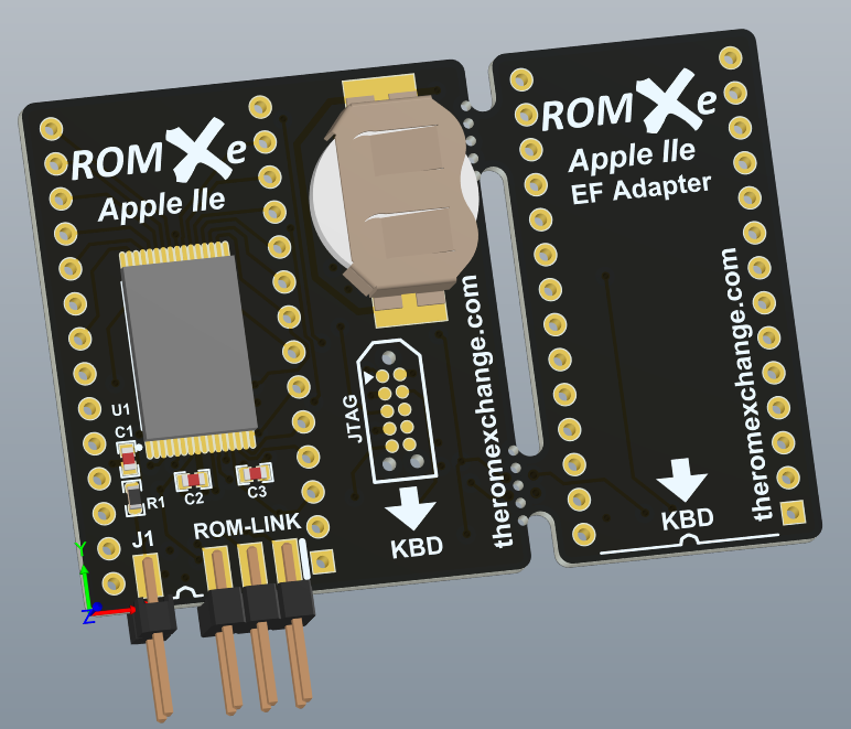 ROMXe plugs solely into the ROM socket(s) in a //e. For single CF ROM machines, the EF Adapter can be snapped off. Note that ROMXe has a real time clock onboard as well - that's a CR1220 lithium cell, which should be good for around 4 and a half years between replacements.