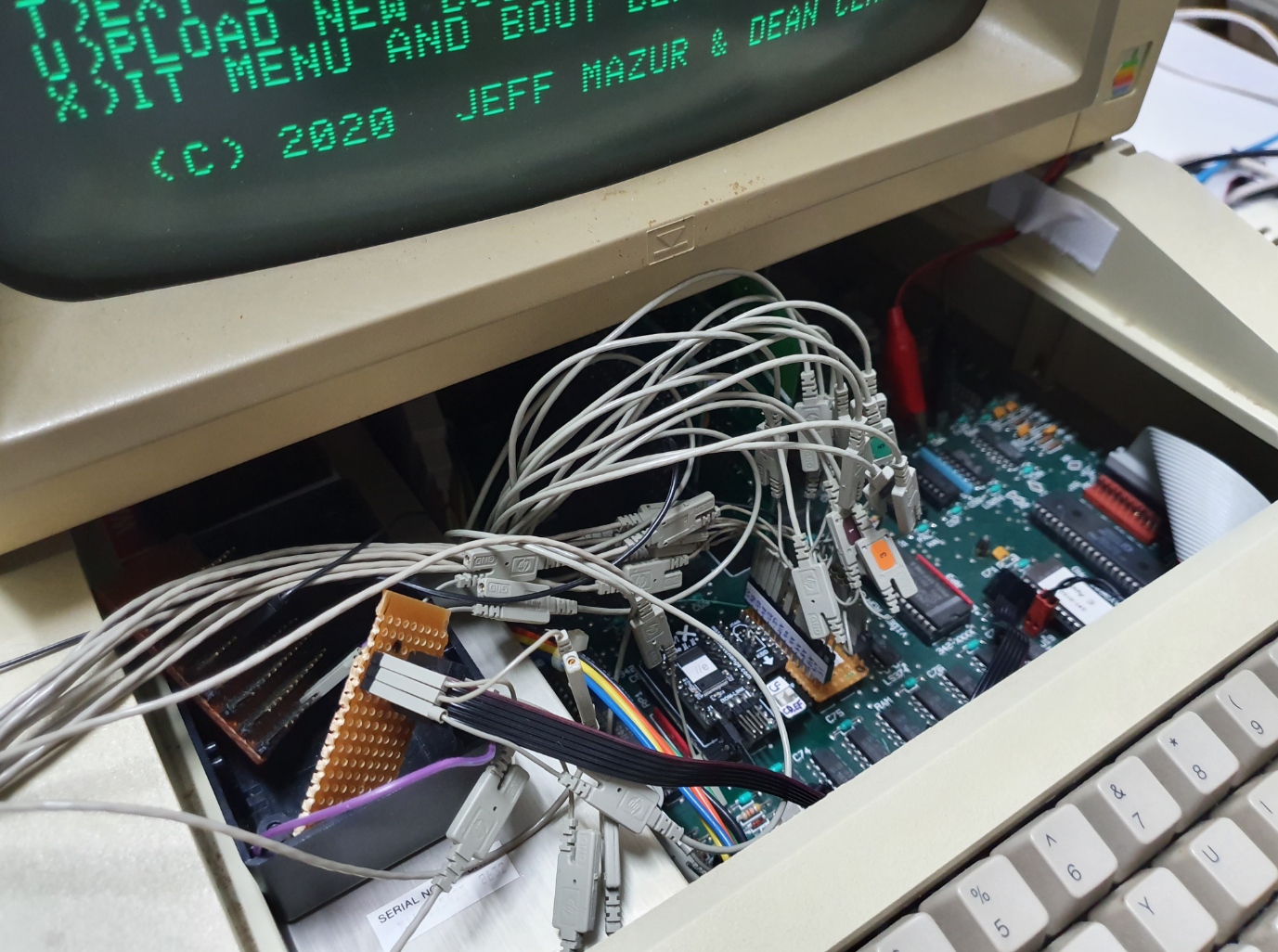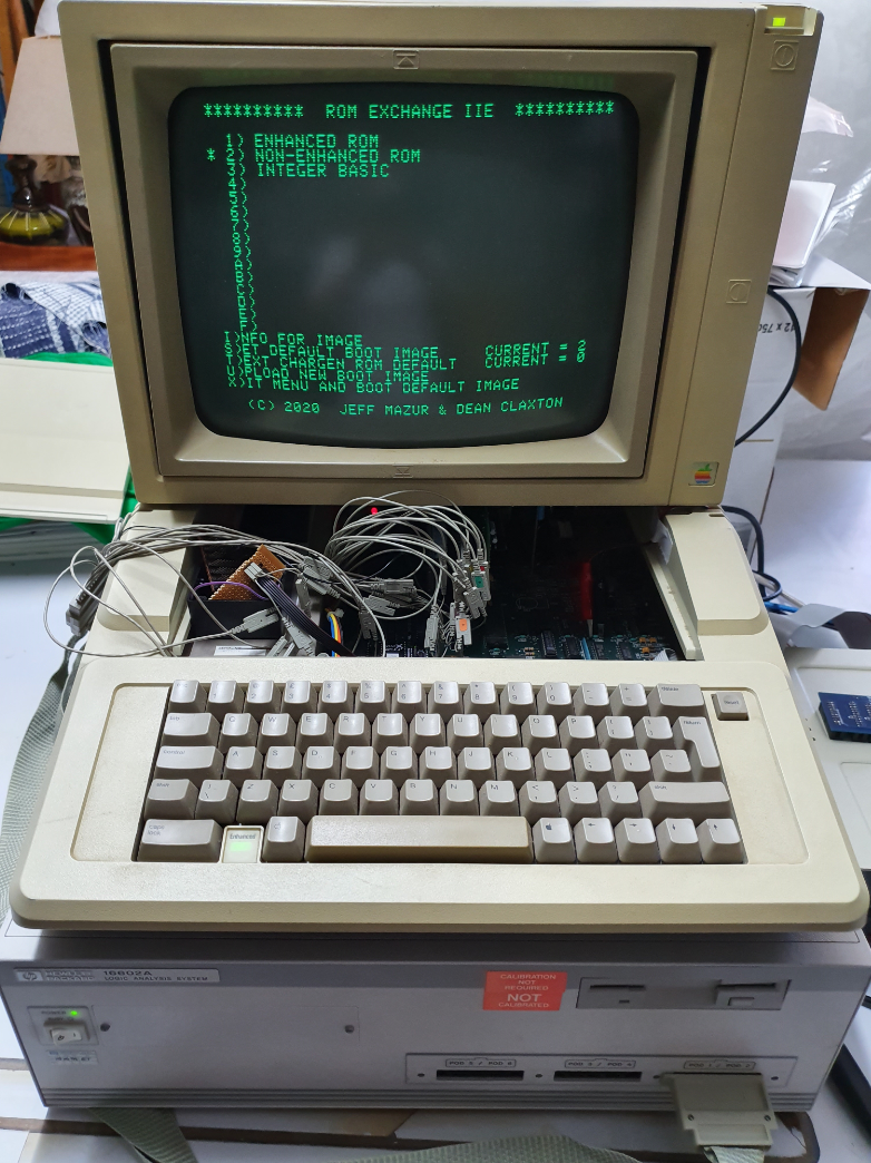 This prototype ROMXe board was built with a II plus ROMX, along with socket adapters to suit the //e - this was enough to get it up and running. We'll now be looking to order a handful of ROMXe boards so we can continue to further enhance the firmware including the real time clock support and also the NMI support for Senior PROM.