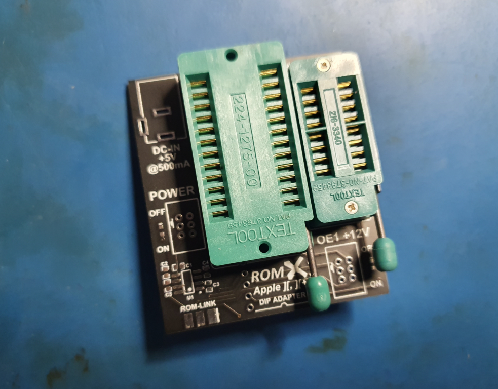Speaking of the //e version of ROMX, I cobbled together a set of adapters that allowed me to use the Apple II plus version of ROMX to get the basics working for the //e. The EF ROM adapter board will be optional, required for those with earlier //e's that have the CD and EF ROMs on board like the one I'm testing with. For machines with just a single CF ROM (Extended keyboard IIe, IIc, etc) the EF adapter will not be required. Perhaps we'll still include it in the kit just in case you want to move ROMX to another machine with dual sockets though.