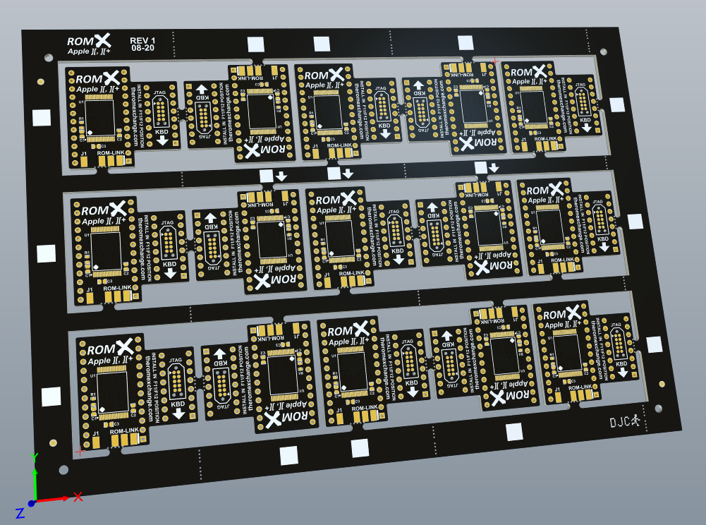 The main reason why I want to put the boards on a panel (versus individually routed boards) is to reduce the assembly time. A solder paste stencil can be ordered with the boards - solder paste is applied to the panel with a squeegee, leaving solder paste only on the areas exposed by the stencil (the component pads). The parts can then be placed either by hand, or by pick-and-place machine onto the panel. Once placed, the panel is put into an SMD reflow oven where it is heated (following a specific reflow temperature profile) - the solder paste will melt, soldering the parts onto the panel. When cooled, I can repeat the process with the parts on the other side of the panel. The end result is that 15 ROM X boards can be done at a time, relatively quickly. A lot faster than hand soldering them! Of course there is still the hand soldering of the headers and pins, but a fair amount of time will saved by semi-automating the soldering of the other components.