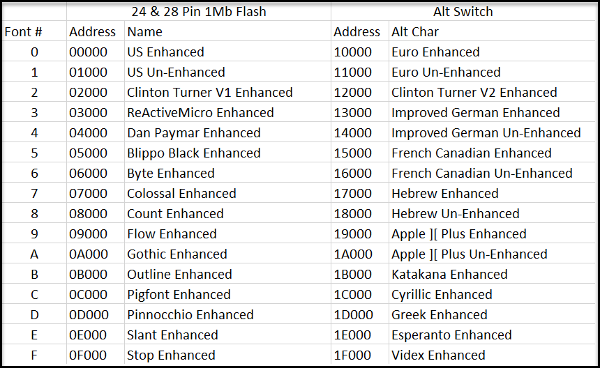 The fonts in the Alt Switch column are switched in via the keyboard switch on a //c, or via the switch under the right side of the keyboard of international version Apple //e's (28 pin video ROM). For US Apple //e's without the switch, we have a 24 pin Video ROM module with a header that would allow a switch to be attached to toggle the second bank of fonts. The same 24 pin Video ROM could be used on a //c BTW, by placing it in the rear of the 28 pin socket however its more of a challenge to get a switch installed (or run one outside of the case) thus we thought the better option is to use the inbuilt keyboard switch.
