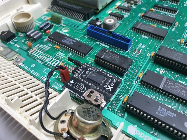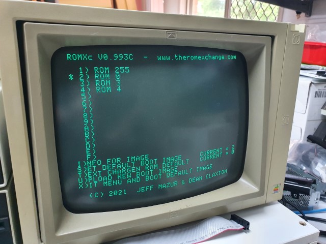 The photos below are representative of the final hardware version of the ROMXc, but the software side has evolved somewhat. I'll put up some more current images of the menu when I have a chance - the current revision firmware displays the date and time on the info menu (with seconds ticking over), plus the clock will ultimately be set/configured through the ROMX menu as well. At present we have a disk utility to set the clock. Once set, the time is retained by the onboard CR1220 lithium battery - which should last a number of years. Jeff has also written a ProDOS driver to support the clock chip that we are using.