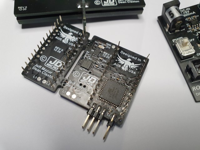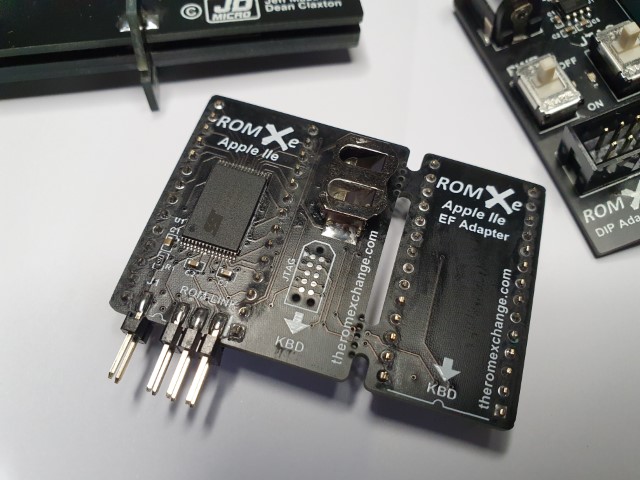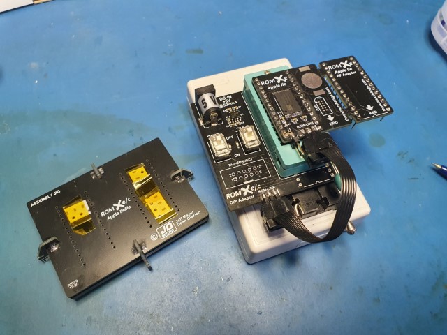 We assembled a ROMXe board, and the programming adapter. This is pretty much what the production ROMXe PCB will look like :