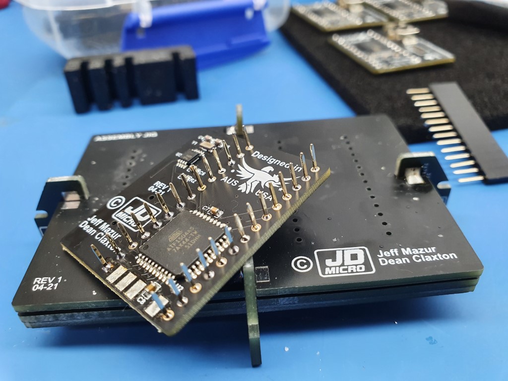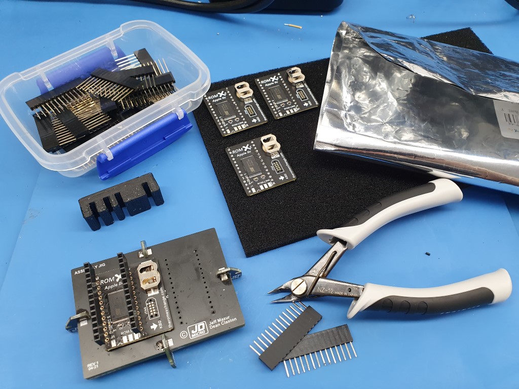 The new jig for ROMXc & ROMXe sets the pin length to 4mm for the video ROM to keep it nice and low under the disk drive - works out to be a touch over 5mm for the ROMXc module as it has components on the underside which lift it off the jig a little :