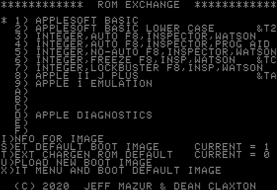 ROMX is an in-system programmable device that replaces the system ROM chips in your Apple II/II+ computer. It will store up to 15 ROM images, and present them for selection via an on-screen menu that is displayed at power up. In addition, the menu system itself (the ROMX firmware) is updateable in-system.
